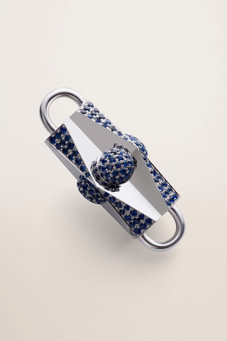 Large Mother Lock, 18k White Gold, High Shine Finish, Pave Blue Sapphire Center and Edges, 35 mm